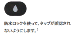 機能は凄くシンプル、水滴がタップと誤認されないためのボタンです。 シャワーなどを浴びてみるとわかりますが、結構水滴とタップを誤認しているので、メッセンジャーアプリで不用意に他の人にメッセージを送ってしまうこともあり得ます。 水滴モードの解除は、デジタルクラウンをクルクル回すことで出来ます。 その他のアイコンの説明は、アップルのサイトを御覧ください。 https://support.apple.com/ja-jp/HT206951