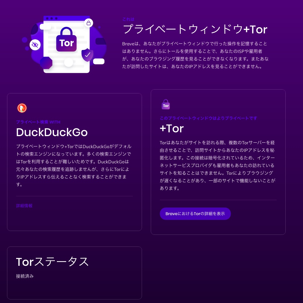 ・余計な広告が表示されない。 表示される広告をコントロールすることができて、表示広告数に応じてBATポイントが貰える。 ・2種類のプライベートウィドウが用意されており、通常のGoogleクロームと同等のプライベートウィンドウに加え、Tor技術を使い複数のサーバを経由することでIPアドレスを秘匿するプライベートウィンドウ+Torが使えます。 ・Chroniumベースなので、Google Chromeからの移行が簡単