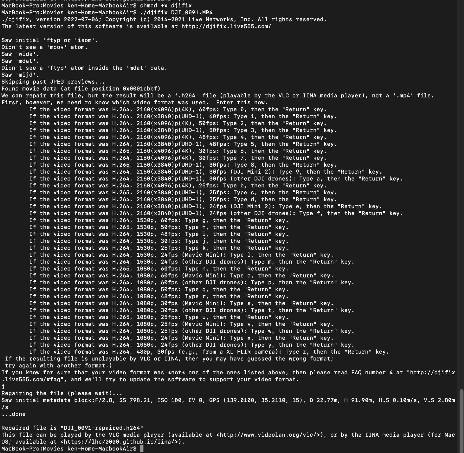Enter djifixが破損したファイルに対して実行されます。 すると以下のような画面が表示されます。 簡単にいうと、どんな設定で録画しましたか?ということです。 ご自身の設定を選んで、該当の文字をタイプしてEnterです。 ちなみに私の場合は、 1530p(2.7K)、30fpsだったので”j”をタイプしました。 (Mavic miniという文字に惑わされていつもいろんな設定を試しては失敗を繰り返しています・・・)わからなければ、面倒ですがドローンを起動させてスマホから設定を確認するとか、正常に録画されたファイルの形式を確認してみてください。