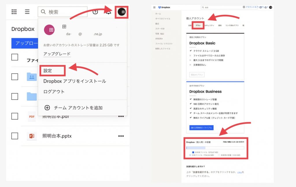Dropboxホーム画面右上のアカウントアイコンから、個人アカウントページへ移動し、プランのタブを開くと下の方にDropboxの容量が表示されています。