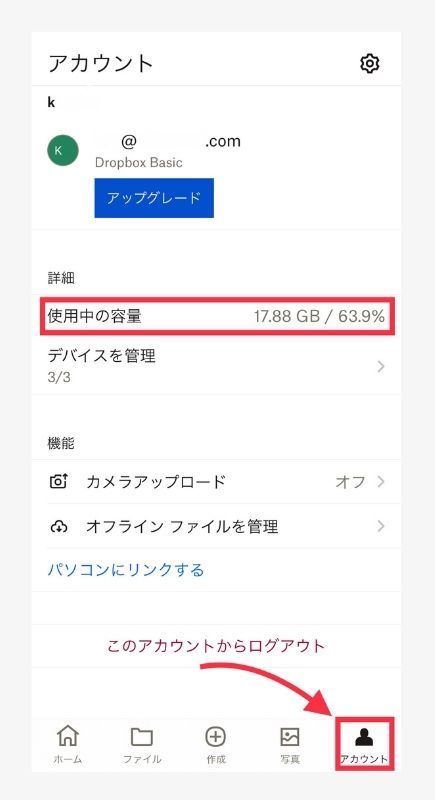 Dopboxのアプリでは、アカウント画面に使用中の容量が表示されているので、すぐに確認することができます。