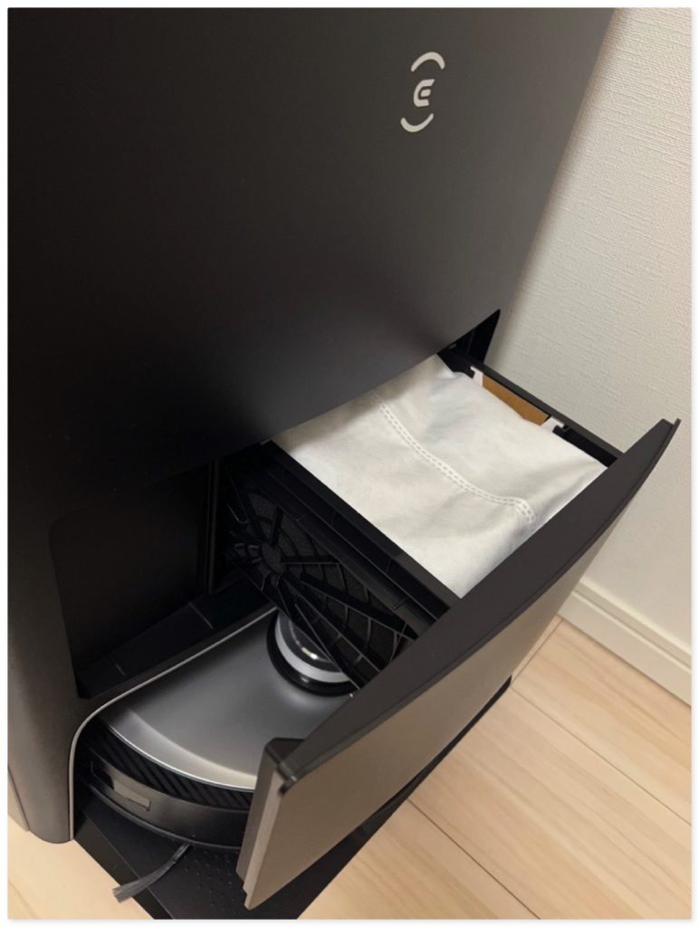 紙パックはステーション内に設置しておいて、掃除完了後ロボット掃除機がステーションに戻ってきたゴミを回収するためにあるものです。 従来のステーションにダストボックスがないものだと、ロボット掃除機本体の小さなダストボックスが数日でいっぱいになってしまうため、頻繁にゴミを捨てる必要がりました。 ECOVACS DEEBOT X1 OMNIの場合は、ステーションに設置するダストボックスは紙パックなので、紙パックごと捨てることができて、掃除はとっても楽ちんです。 ※紙パックは昔からある手押し掃除機に付いているものとサイズ感も見た目もそっくりです。もしかして昔ながらのタイプ使えちゃうんじゃないかと思っちゃうくらいです。(手持ちがないので、確認はしてません) 容量は2.5L、公式では2ヶ月間利用可能となっています。1ヶ月間使っていますが、まだまだ大丈夫そうです。
