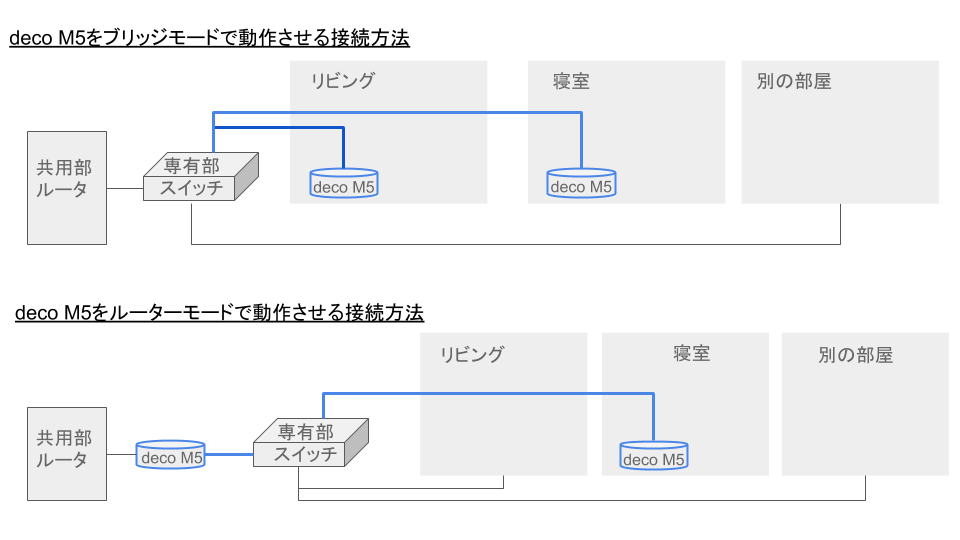 我が家(マンション)には各部屋にマルチメディアコンセントという有線LANの接続口があります。 当然これを使えば、イーサネットバックホール機能を使うことが出来ます。 しかし設置場所によって、メッシュルータが、ブリッジモード(ルータ機能オフ)となるか、ルータモードになるかの違いが出てきます。 図を見て頂くと一目瞭然かと思いますが、 我が家はマンションなので、ルータが共有部にあり、専有部である宅内には、スイッチが置かれていました。 ※青い線の部分がイーサネットバックホール 今回は、メッシュルータのルータ機能を最大限活かすべく、下の構成としました。
