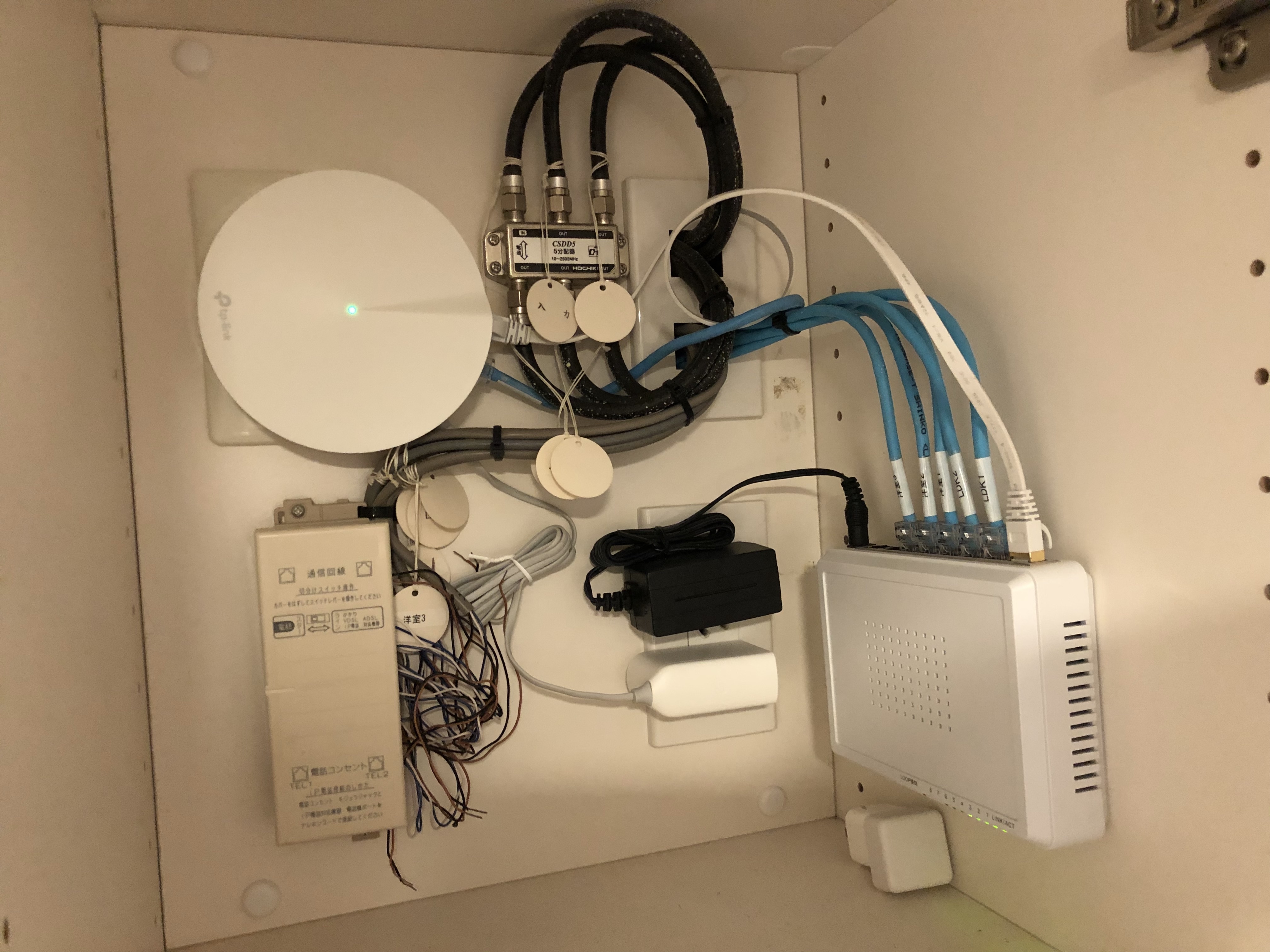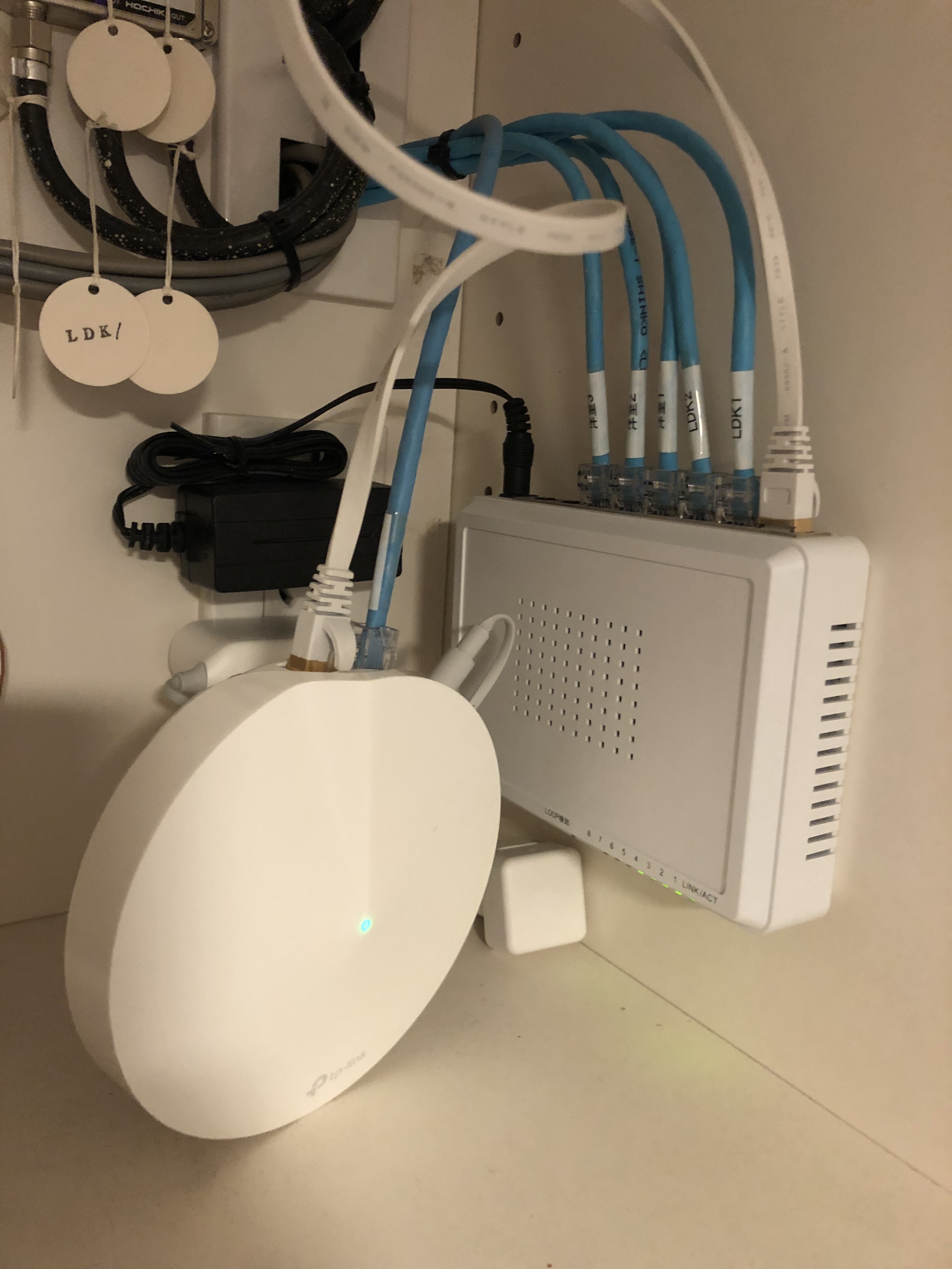 画像の左に見えるのがtp-link Deco M5 右側の四角いのがスイッチ(ハブ)です。 元々は青いLANケーブルが右のスイッチに繋がっていました。 今回は、この内の共用部から繋がっているLANケーブルをdeco-m5に差し替えて、別のLANケーブルで、Deco M5からスイッチングハブへ指し直しました。 この場所は、実は下駄箱の一部なのですが、配線をコードの裏側に回したら、ちょうど良い感じに収まってくれました。