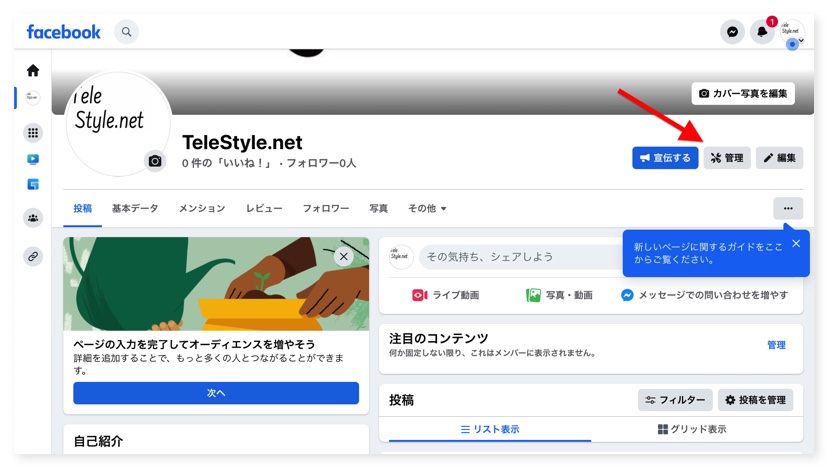 1. Facebookページの右上に表示されている管理 ボタンをクリック