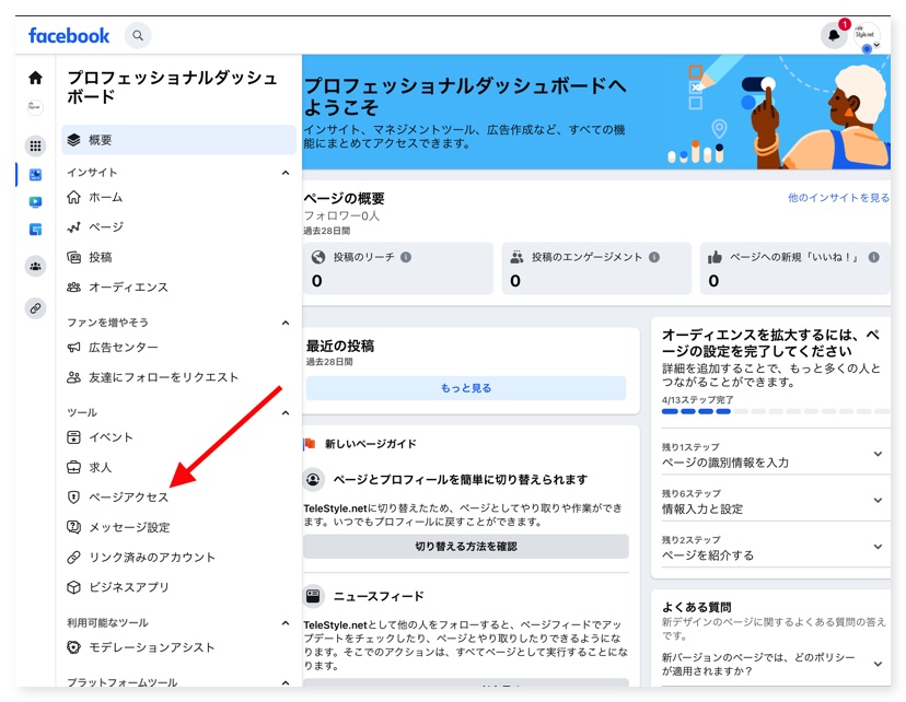 2. 管理ページの左メニューからページアクセス をクリック ページアクセスから管理権限の設定を行うというのは、ちょっと分かりづらいですね。
