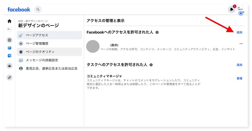 3. アクセスと管理と表示ページ、右側から、Facebookへのアクセスを許可された人 の右側にある追加 ボタンをクリックします。 共同管理者 共同編集者をここに追加するって、なんか印象違い。