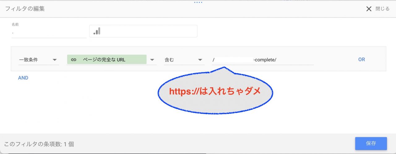フィルタの編集画面で、”ページの完全なURL”を選択した場合の値は、https://をいれてしまうと”データなし”の表示となってしまいます。 https://以降、もしくは階層やファイル名を入力しましょう。