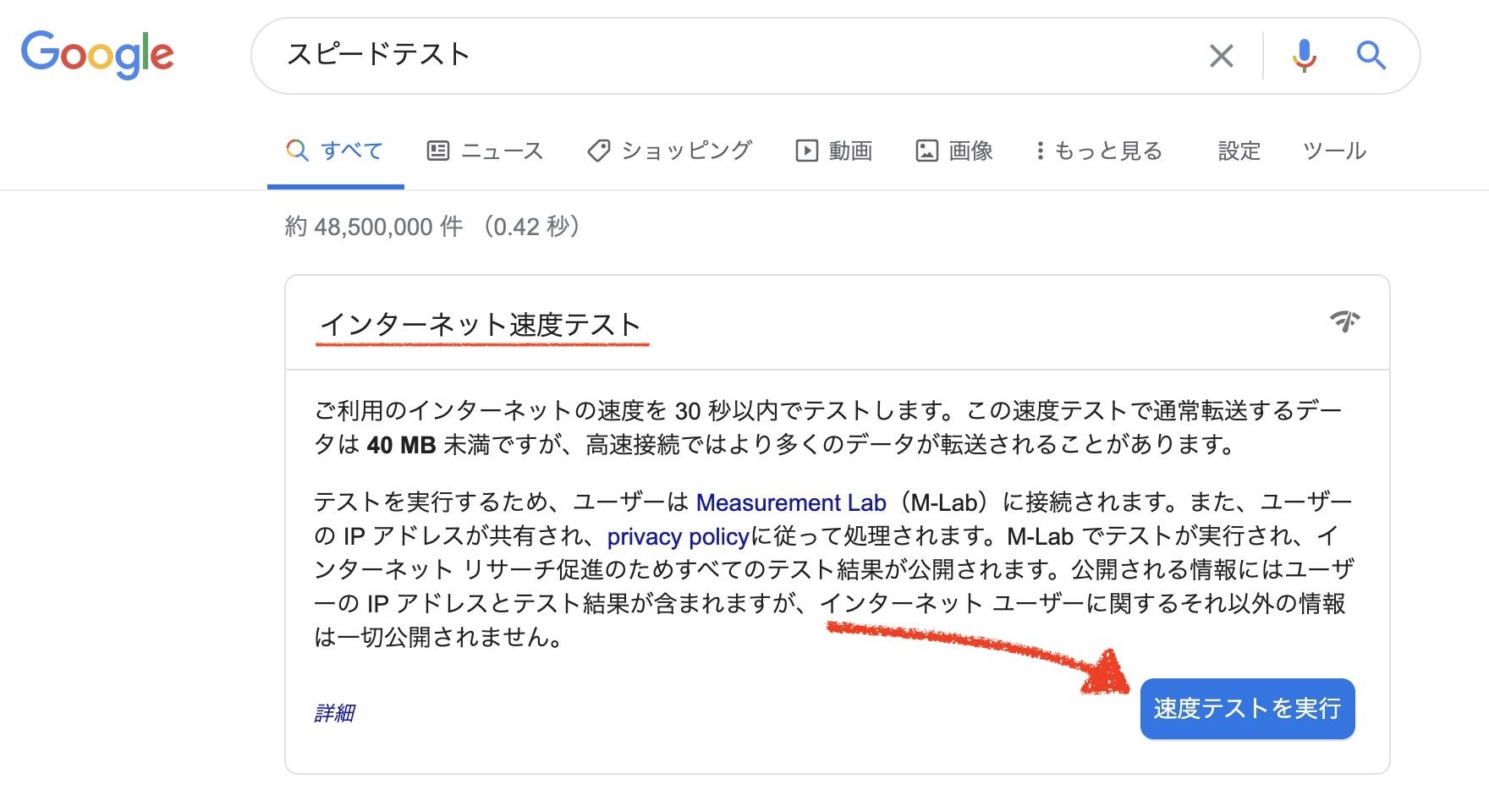 Googleで【スピードテスト】と検索すると、一番上に、【インターネット接続速度テスト】と表示されます。 右下の、【速度テストを実行】をクリック