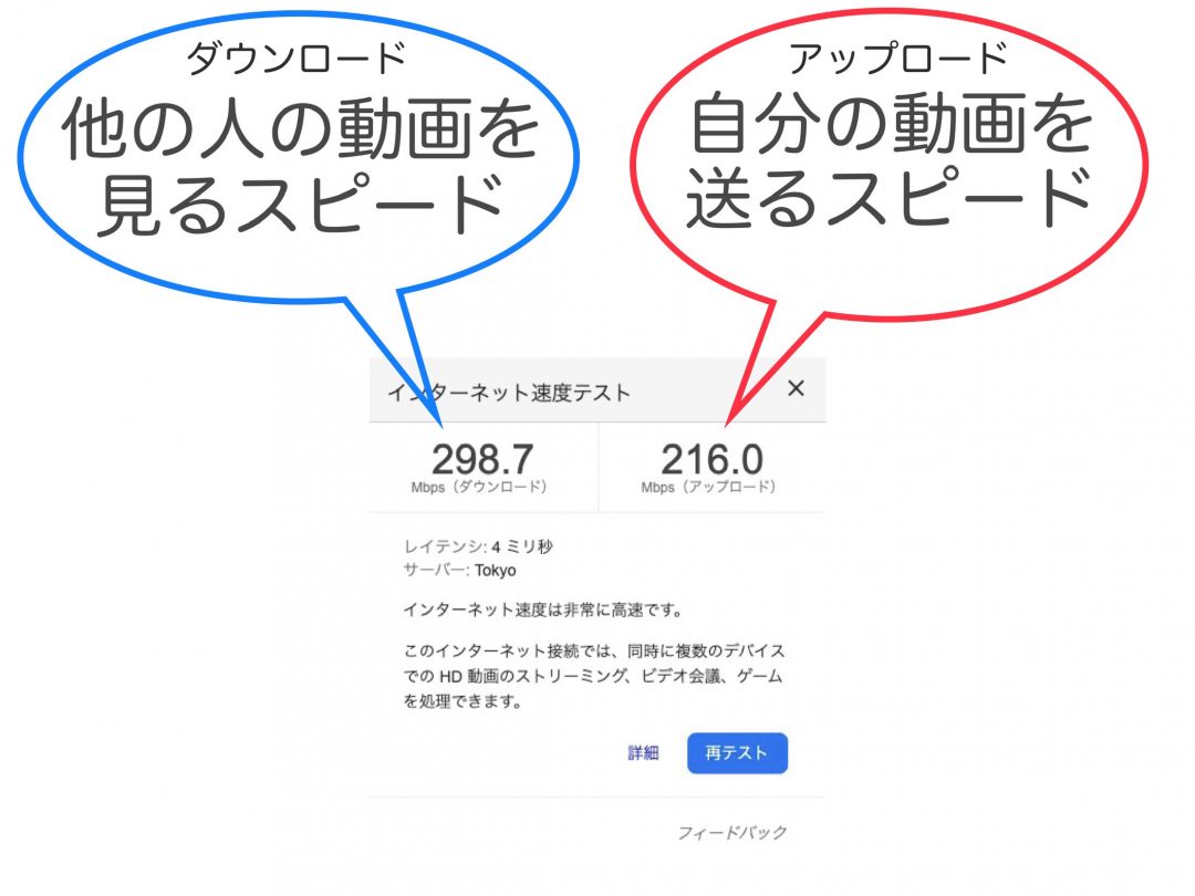 分かりやすい解説付きで、スピードテストの結果を表示してくれます。 動画等を見るだけなら、左上のダウンロードのスピードを見ましょう。 Web会議など、自身の映像を配信する場合は、右上のアップロードのスピードも気にしましょう。