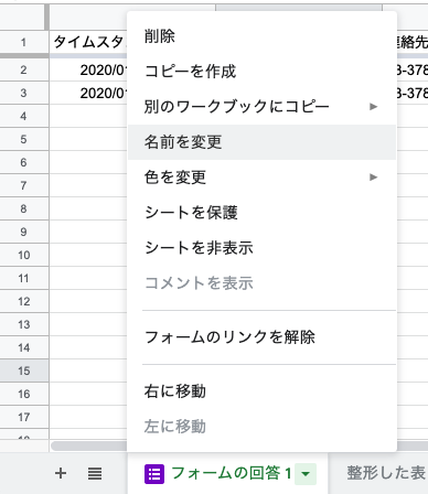 =IMPORTRANGE(“インポートしたいシートのURL”,“シート名!セルの範囲”) インポートしたいセルに上記の関数を入力します。 ※インポートしたいシートのURLとは、 そのままの意味で、インポートをしたいセルをGoogle SpreadSheetで開いて、URL欄をコピペします。httpsから最後までコピーして大丈夫です。これがファイル名の代わりになっているので、別のアカウントでもアクセス権が許可されていれば大丈夫です。 ※シート名とは、 Google SpreadSheetの画面左下に表示されているシート名です。 数字の前スペースが入っていたりするので、以下のような手順で、名前を変更からコピペすることをオススメします。 以下の画像だと、『フォームの回答 1』になります。 次にセルを読み込むために、『フォームの回答 1!』と最後に!を付けます。