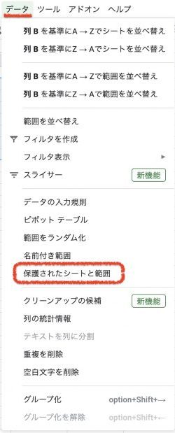2.Googleスプレッドシートのメニューから、”データ” >”保護されたシートと範囲”をクリック