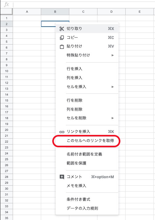 範囲を選択した上で同じように右クリックすると、【このセルへのリンクを取得】が【この範囲へのリンクを取得】に変わります。 リンクをクリックしたときに、スプレッドシートファイルが開くとともに、指定したシートの選択した範囲が選択された状態で開かれます。 沢山のシート数が含まれていたり、多量のデータが入ったシートの特定のエリアを見てもらいたいときに、非常に便利です。