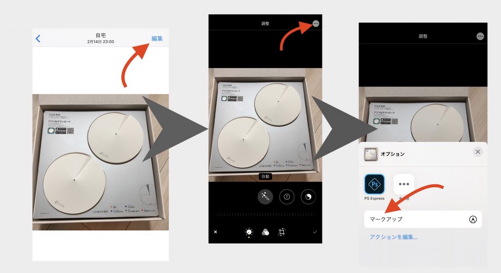 - マークアップをタッチ ここでマークアップが出ないときは、”アクションを編集”をタッチしてみて下さい。