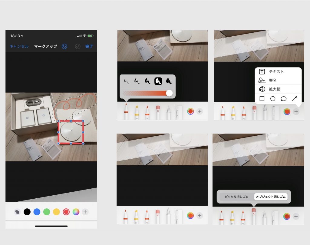 編集したい写真を開いて、マークアップ機能を開けば、簡単に書き込み画面に移ります。 画面は凄くシンプルな構成です。例えるならば、機能限定版のパワポみたいな感じ? マークアップ機能を起動する方法