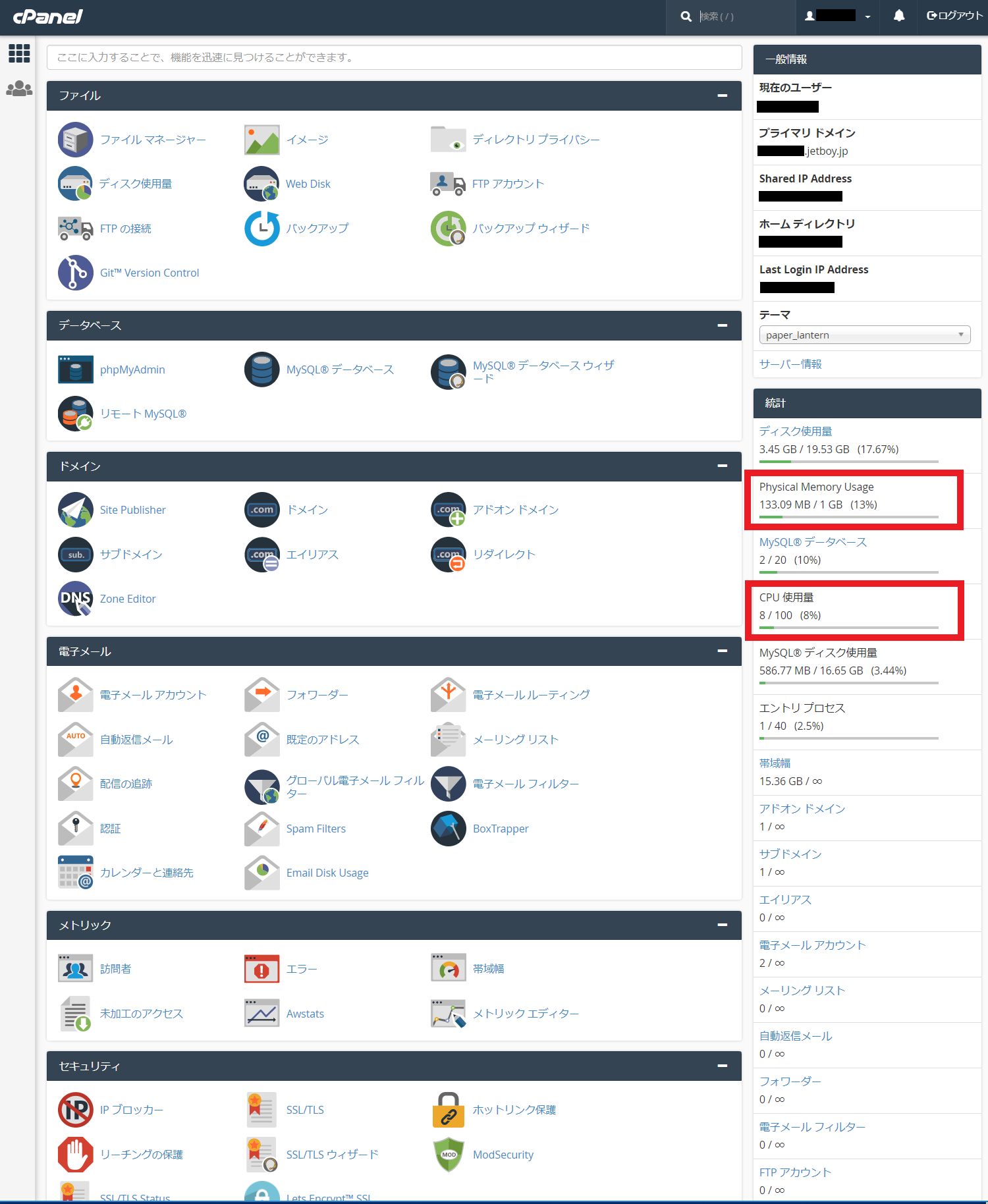こちらは、先程の契約サーバー毎の管理画面によりも細かい設定ができる画面です。 メモリやCPUの負荷状況も、リアルタイムですが、確認することができます。 負荷の確認は、赤枠をつけたところです。
