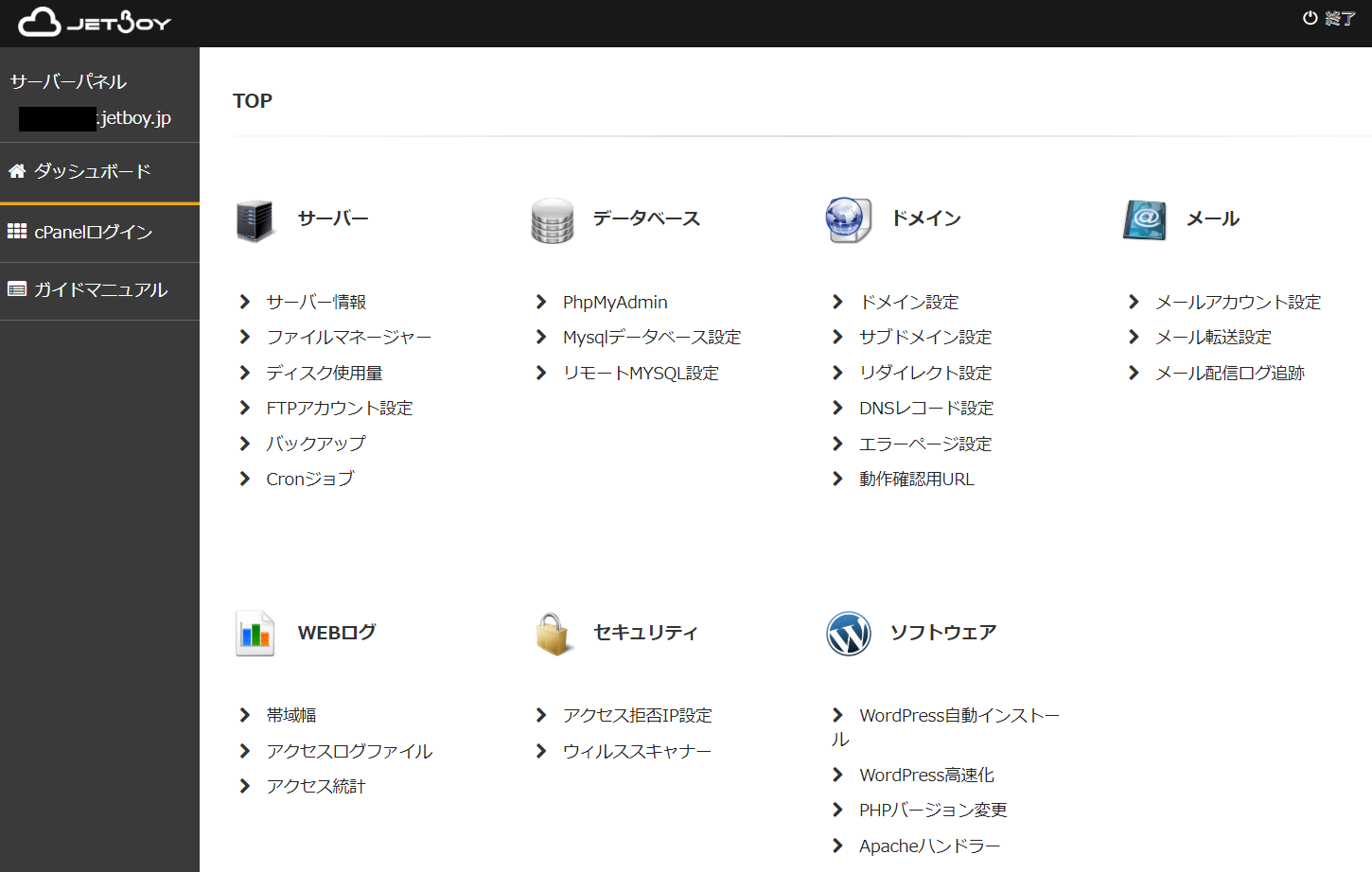 ログイン後の最初の画面です。サーバー障害情報やメンテナンス、そしてその下の階層への入口になっています。 私の場合は、一つのサーバーしか契約していないので、先程のご契約サーバーが1台。