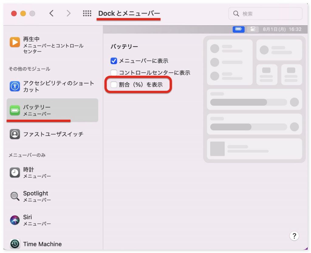 メニューバーのバッテリー残量表示は、Docとメニューバーから設定するのじゃ。