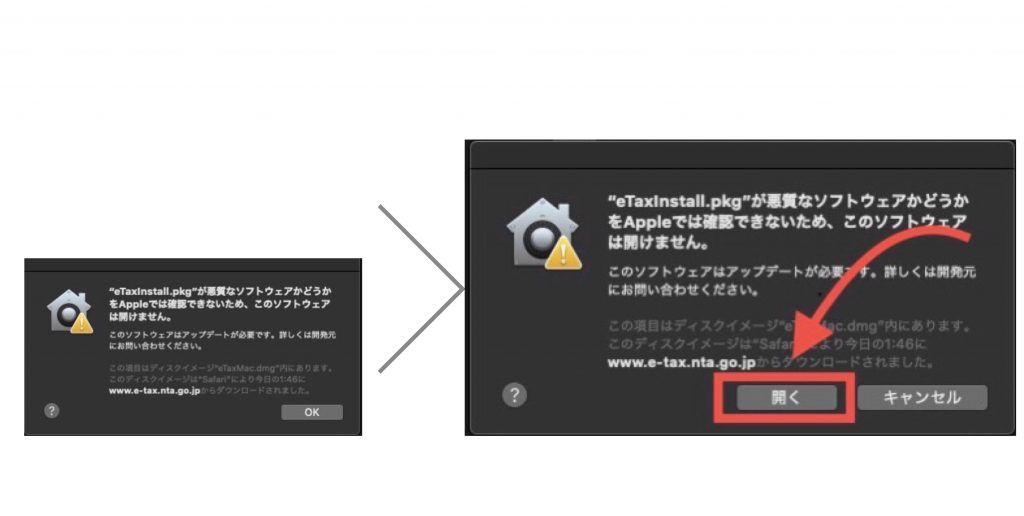 “eTaxInstall.pkg”が悪質なソフトウェアかどうがをAppleでは確認できないため、このソフトウェアは開けません。 のソフトウェアはアップデートが必要です。詳しくは開発元にお問合せ下さい。 この項目はディスクイメージ”eTaxMac.dmg”内にあります。 このディスクイメージは”Safari”により今日の〇〇時にwww.e-tax.nta.go.jp からダウンロードされました。