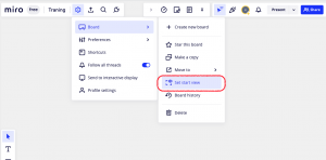 Miroボードを開いたときに、スタートビューを指定しておけば、誰が開いても指定した場所とサイズでボードが開くように設定できます。 方法は、簡単! ボードの右上の縦線3本のアイコンからボードの設定を呼び出し、 プルダウンから、Set start viewを設定をクリックして、範囲をしています。