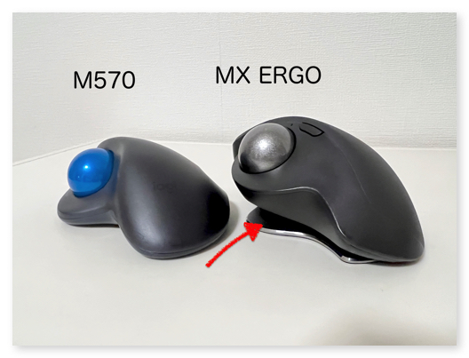 MX ERGOを持ったときの重さには驚きましたが、トラックボールマウスは持ち運ばないと思うので特に問題はありません。逆に持ち運ぶ人は要注意です。MX ERGOの重さの原因は、角度調整をするためにマウス底面についている鉄板です。 ちなみにMX ERGOは259g、M570は108g