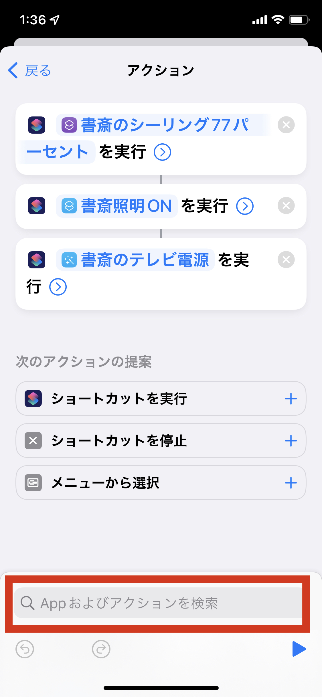 アクションの画面の一番下「Appおよびアクションを検索 」のところで「ショートカットアプリ 」と入力 ↓ スクリプティングから、「ショートカットを実行 」 ↓ アクション画面に追加されたアクションの薄文字にになっているショートカット の部分をクリック。 するとマイショートカットの一覧が出てきます。