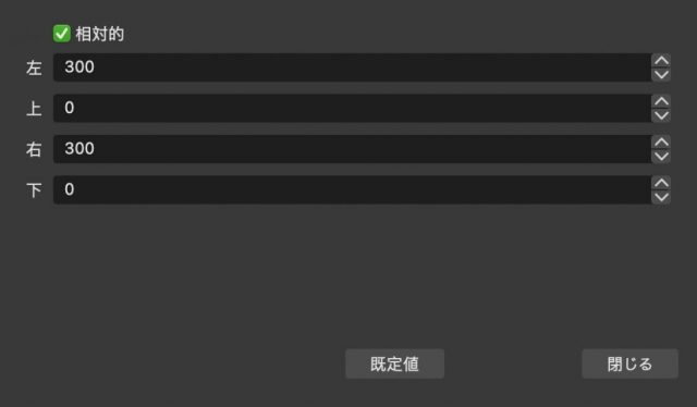 クロップ/パッド の設定画面。 上下左右それぞれ別々の値を設定することが出来るので、固定されたWebカメラであっても、右だけだったり、上だけだったり設定を変えることができます。