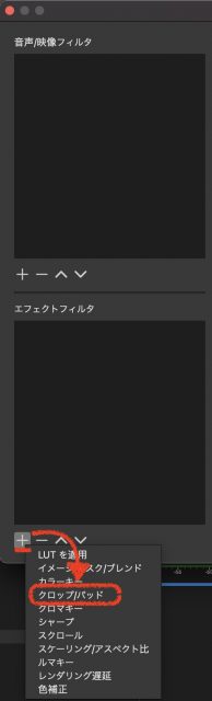 フィルタ画面左下のエフェクトフィルタボックスから、左下の+ボタンから、クロップ/パッド を選択します。