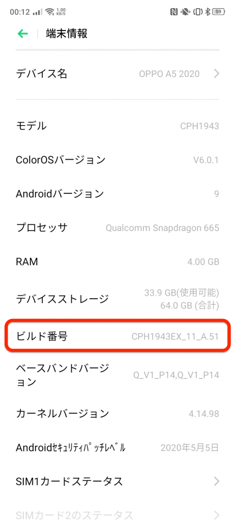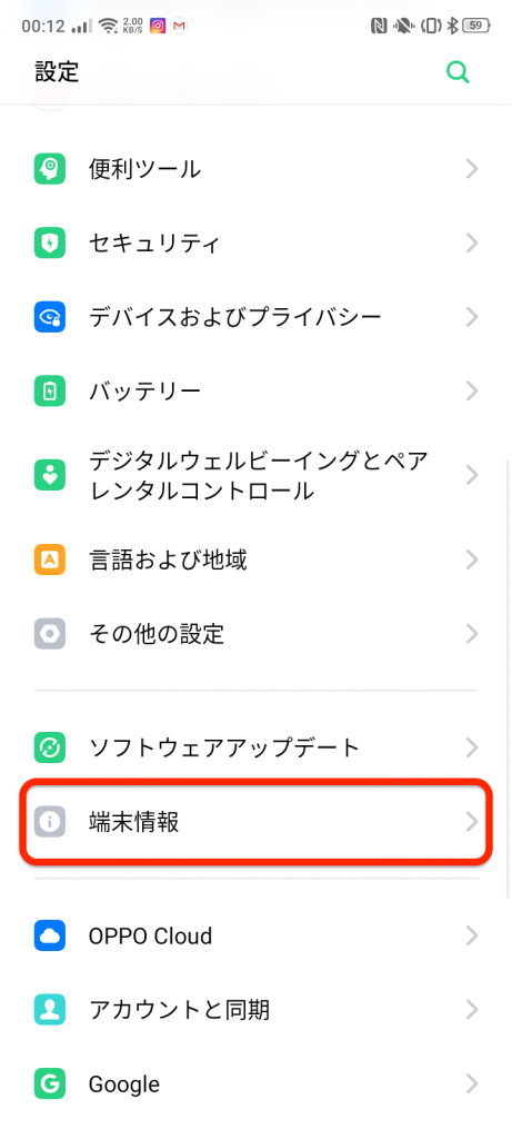 oppo A5 2020を開発モードにするため、設定アプリ>端末情報と辿ります。