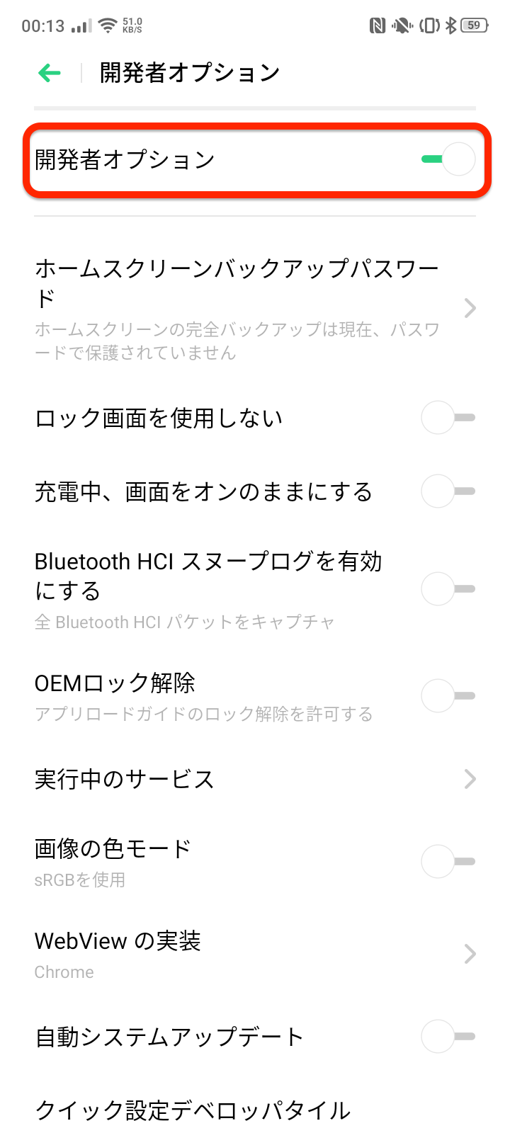 開発者オプションオプションページ、最上段のスイッチをオンに。