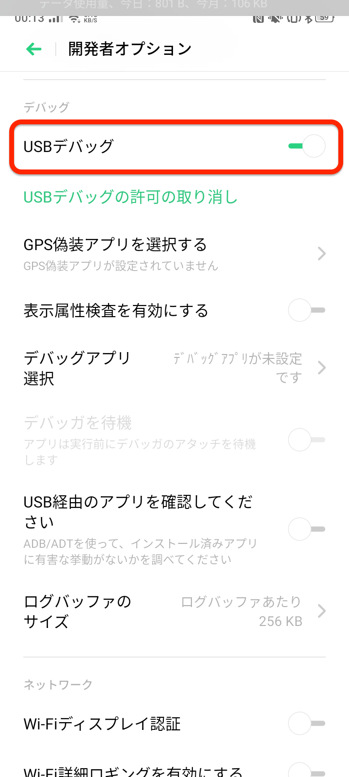 開発者オプション内のUSBデバッグをオンに。