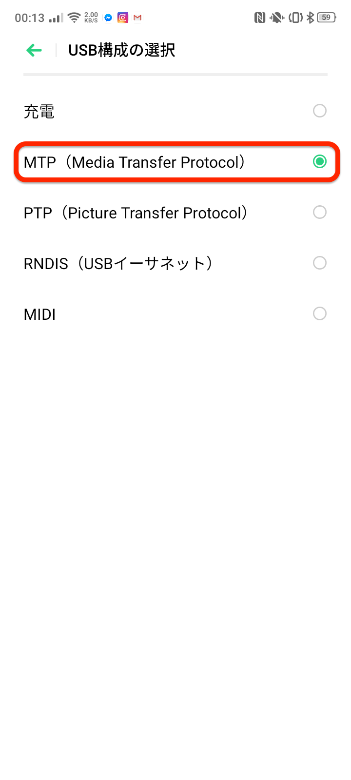 開発者オプション USB構成の選択