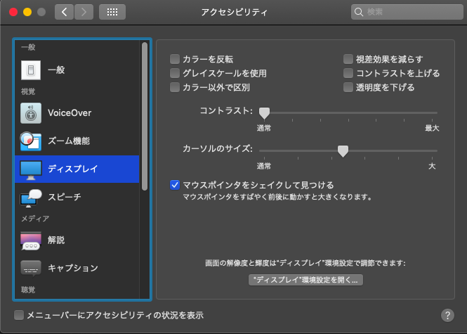 さらっと書くと 左上のリンゴマーク>システム環境設定>アクセシビリティ>ディスプレイ>カーソルのサイズ。 ここのスライダーを動かすことで、マウスカーソル 矢印の大きさを変更することができます。