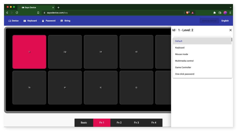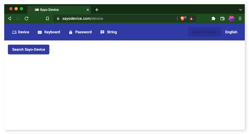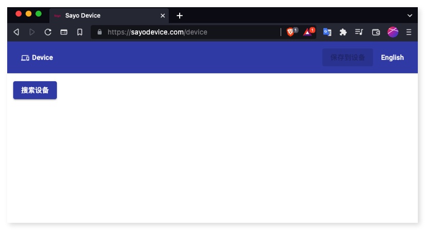 SayoDeviceをMacに接続した上で、公式サイトデバイスページにアクセスします。 いきなり中国語で面を食らってしまいますが大丈夫、右上からEnglishに切り替えられます。