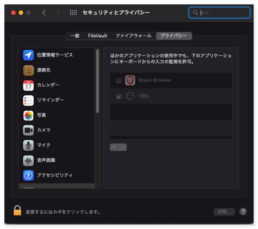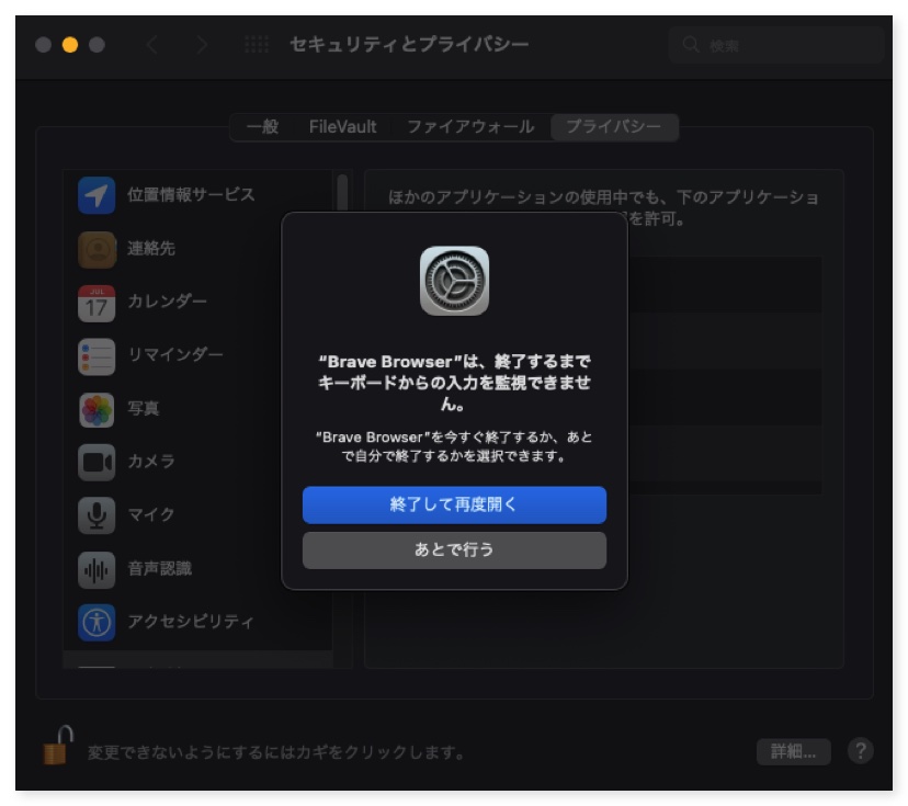 使っているブラウザ(私の場合はBrave Browser)の横にチェックを付けましょう。 ※ウィンドウ左下の鍵マークをクリックしてMacのログインパスワードを入れないとチェックは付けられません。