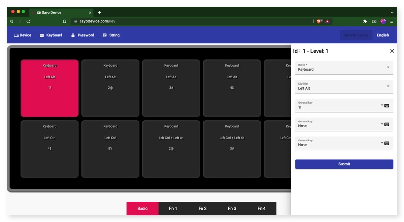 画面に自分が接続しているミニキーボードSayo Deviceのキーが並びます。 設定したいキーをクリックして、右側に表示されるメニューから設定します。 Keyboardモードでは4つのキーまで設定することができます。 なお画面下部のBasic Fn1〜4は、キーボードを階層に分けて階層切り替えボタンを一つのキーに割り当てることで、キーボード数×5の数のキーを設定することができます。利用するシーンが明確に分かれている場合は、ここで別々のキーをプログラムしてしまいましょう。 設定後はSubmitキーを押し忘れないようにしましょう。