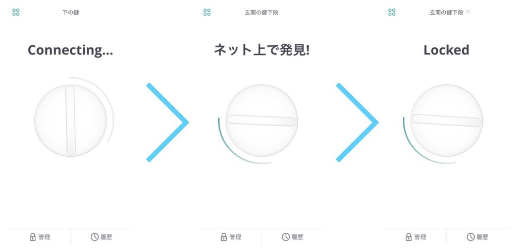 正しいセサミミニの画面の遷移は、Connecting>ネット上に発見>Lock or unLocked Connecting (アプリからセサミへの接続中) ネット上で発見 Locked or unLocked