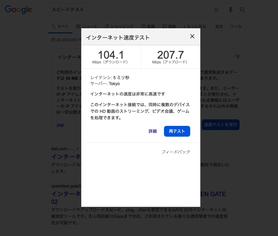 Googleで「スピードテスト」と検索、1番目に表示される「インターネット速度テスト」から、青のボタン【速度テストを実行】をクリックするだけです。 Google公式のサービスです。M-Labというとっころと共同で行っているサービス。 使用するデータ量は、4.4MBなので、音楽を1,2曲分ストリーミングする程度。外出中にスマホでテストしても、さほど気にならない量です。
