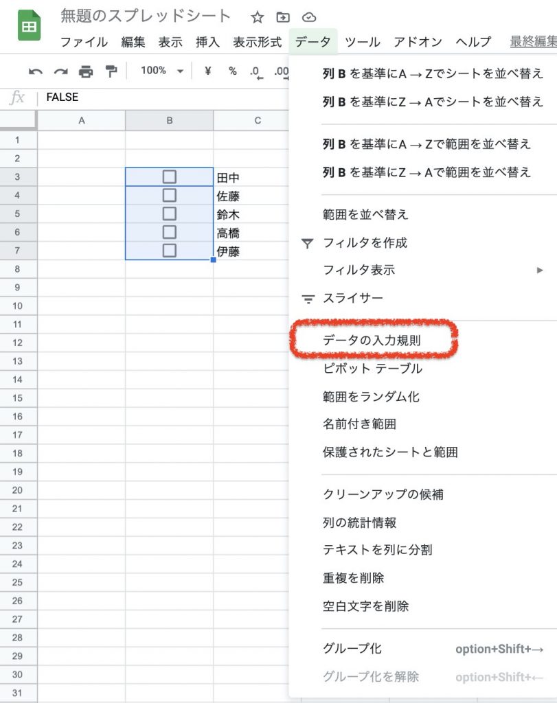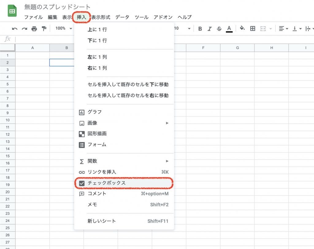 チェックボックスを作りたい範囲を選択した上で、メニューから”挿入” > ”チェックボックス”を選択することで、範囲全体にチェックボックスが作られます。