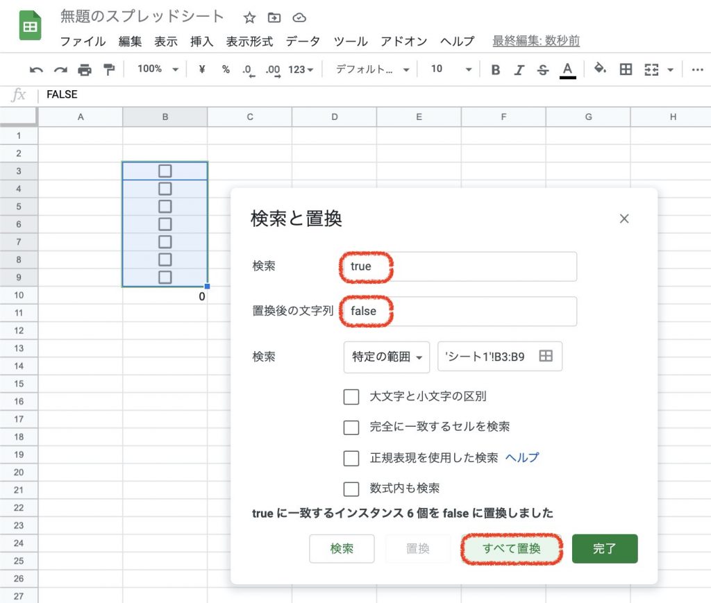残念ながら、メニューやショートカットキーでは、チェックボックスのオン オフを一括ですることはできません。 GASを使う方法もありますが、GASはスクリプトを書く必要があるので、ここでは簡単な”置換”を使う方法をご紹介します。 多分一番簡単な方法なので、是非お試し下さい。 チェックボックスをリセットしたい範囲を選択し て、メニューの”編集”から”検索と置換 ”をクリックして、以下の図のように、検索のボックスにtrue置換後の文字列のボックスにfalse と入力し、全て置換 をクリックしましょう。