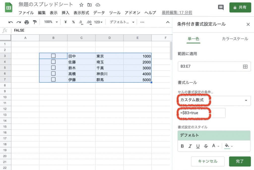 横に長いデータで、チェックボックスのオン オフが分かりづらいときは、条件書式を設定すること行全体に背景色などの書式設定をすることが出来ます。 設定方法は、 設定したい表のセルを範囲選択して、メニューの”表示形式”から”条件付き書式設定ルール”を選択 ウィンドウのサイドに出てくる設定ビューに以下のように設定します。気をつけたいポイントは、 書式ルールの条件をカスタム数式 にすること、そして、その下の入力に入力ボックスに入れる値(条件)で、行に$を入れること。 ※この例では、B列にチェックボックスが入っていますので、B列固定という意味の”$”を入れます。行番号は一番左上の”3”で構いません。範囲に適用でしっかりと表全体が選ばれていれば、自動で下の行まで条件が反映されます。 この例では、チェックが入っている列に色を付ける方法をご紹介しましたが、カスタム数式の条件式の”=$B3=true”を”=$B3=false”とすることで、チェックが入っていない箇所に色を付ける ことも可能です。