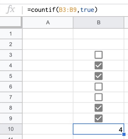 チェックボックスは、チェックがオンのときはTRUE、チェックがオフのときはFALSEという値が書き込まれています。 あとは簡単スプレッドシートに詳しい方はもうわかったと思いますが、あとは、TRUEやFALSEの数をCOUNTIF関数で数えるだけです。 以下の関数を参考にしてみて下さい。 C10セルに、=countif(B3:B,true)という関数を入れることで、B3からB9セル内にあるtrueの数を数えています。 ※Trueはチェックボックスがオンの意味です。 COUNTIF関数で、B3からB9にあるチェックボックスの中からtrueの数を数えます。 合計数を表示したいセルに、=countif(B3:B,true)を入力します。