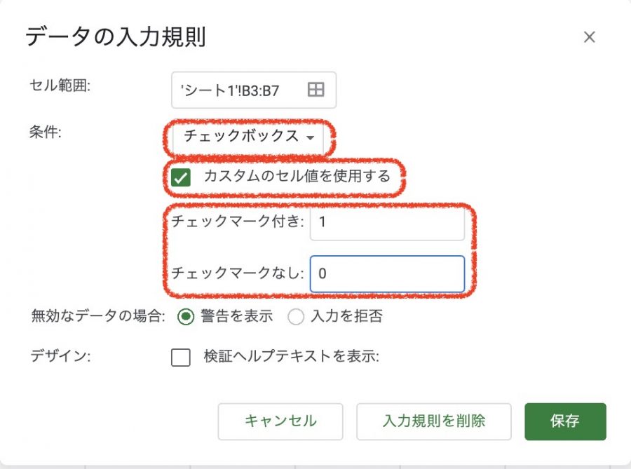 データの入力規則 を使うことで、チェックボックスのオン オフ時の値を、任意のものに設定することも可能です。 例えば、1と0にすることも可能ですし、2と0など都合の良い数字を設定することも可能です。 設定方法は、 メニューの”データ”から”データの入力規則 ”を選択 データの入力規則設定ウィンドウの条件を”チェックボックス”に変更 その下の”カスタムのセル値を使用する ”のチェックをオンに チェックマーク付きと、チェックマークなしの値を任意のものに設定 して下さい。