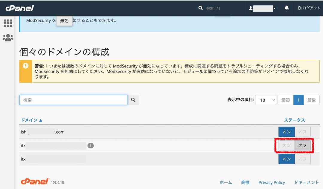 CPanelは、サーバのコントロールパネルから入ることができます。 CPanelのバージョンアップにより、ModSecurityがオンになり、WordPressの投稿更新に影響を与えていました。