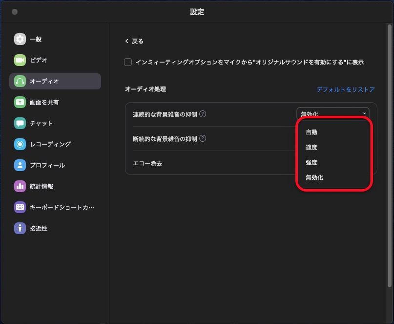 Zoomのノイズキャンセリング機能をオフにして、PC マイクから離れても、同じく音を拾う設定にします。