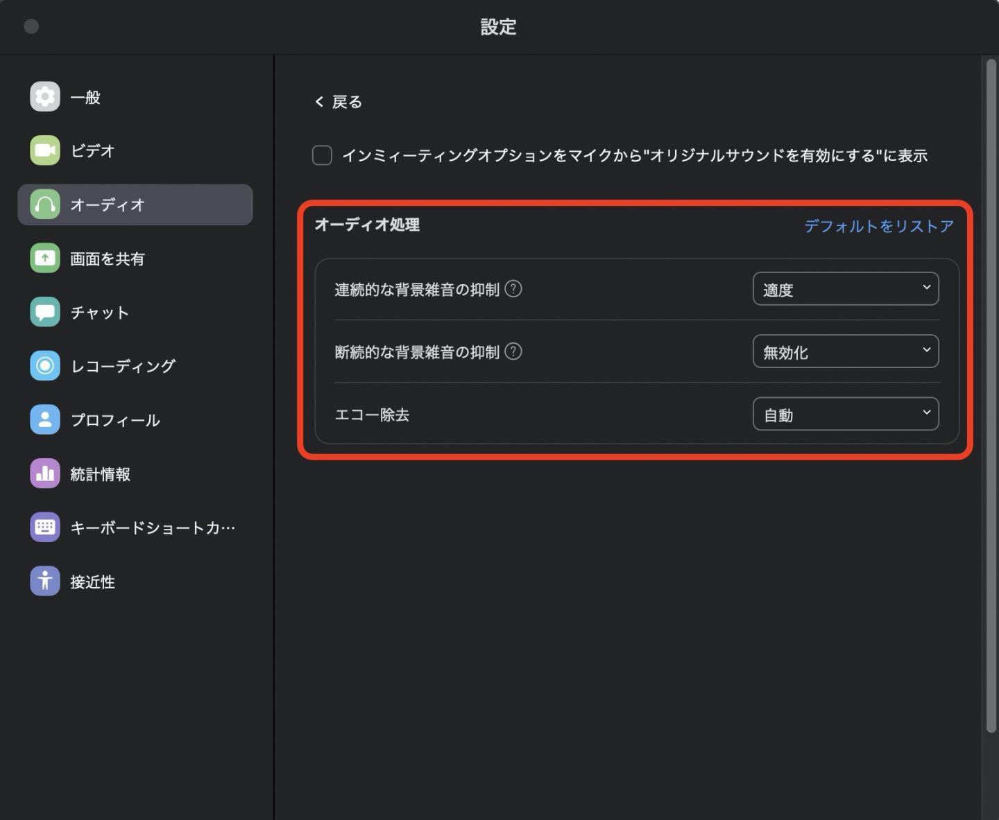 Zoomアプリ設定画面 オーディオタブ