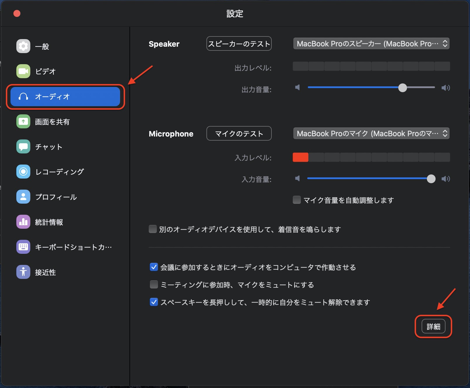 Zoomアプリの設定画面のオーディオタブを開き、右下の小さな【詳細】ボタンをクリック