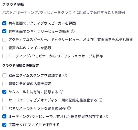 スピーカービューの録画にはクラウド録画を行う必要があり、Zoomの有料プランの契約が必要です。 ※契約するのは2,000円/月の一番下のプロプランで可能です。またプロプランで録画できる容量は1GBまでです。(超過しても2022年2月6日現在録画は停止しません) ※なおクラウド録画には、スピーカービューもギャラリービューも録画することができます。 ZoomのWebサイトにて、クラウド録画について、多数の設定項目があります。 ※チャットや字幕は、録画画面には表示されず、別ファイルとして保存されるので要注意です。ZOOM 録画機能の設定画面