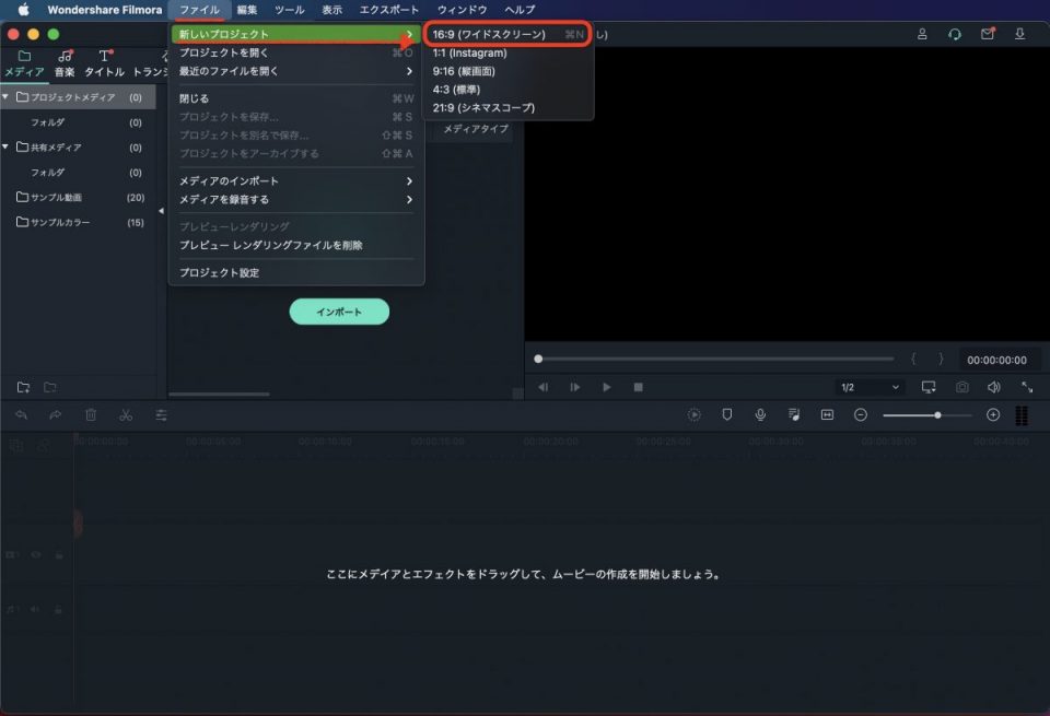 Filmora Xの場合は、ファイルメニューの新しいプロジェクトから、動画の縦横比(16:9)を指定した上で動画を作成できます。