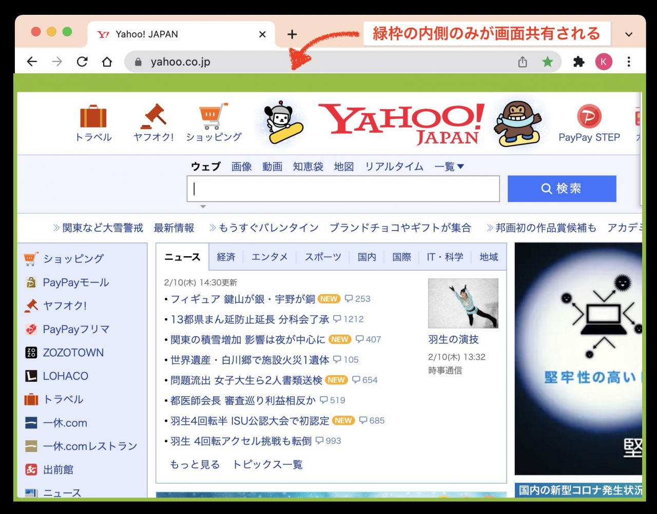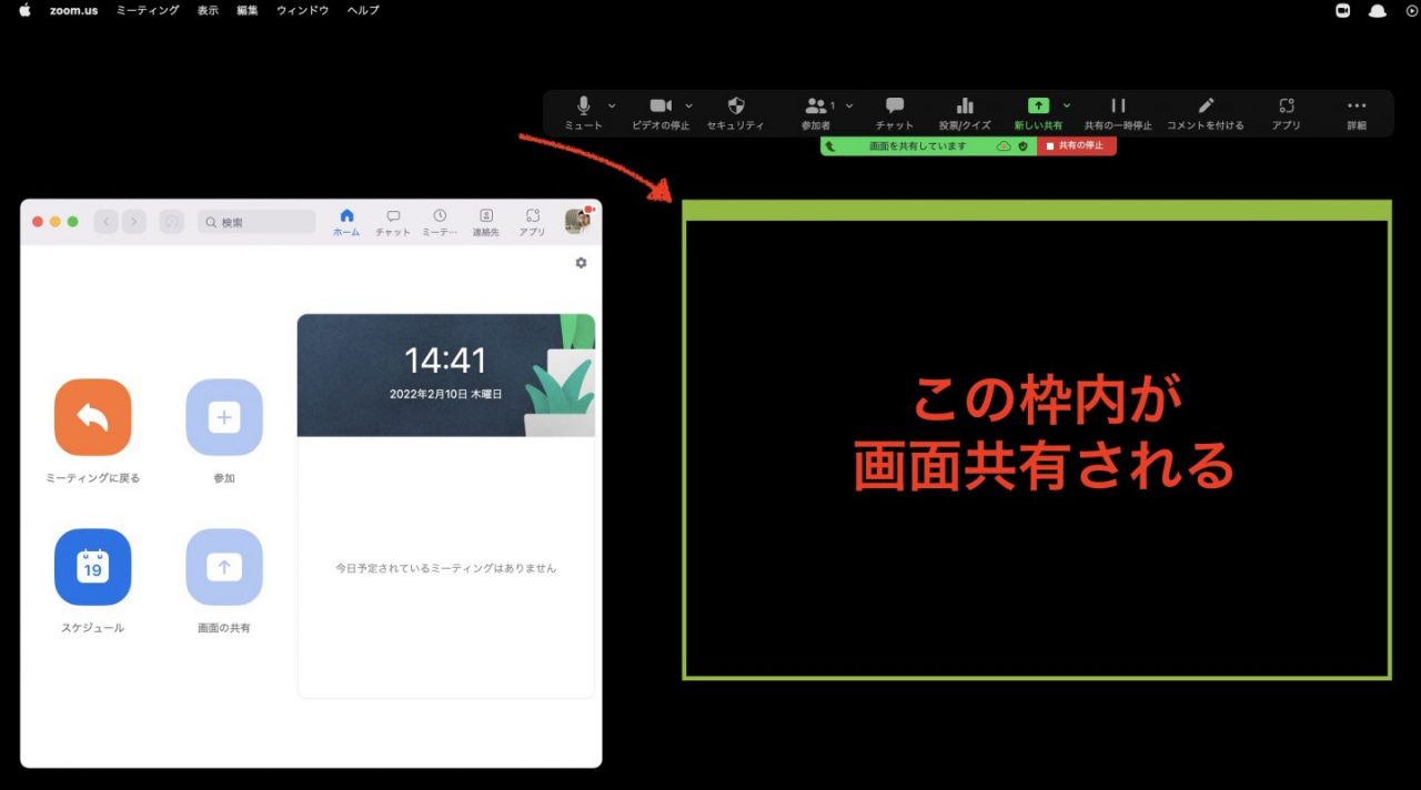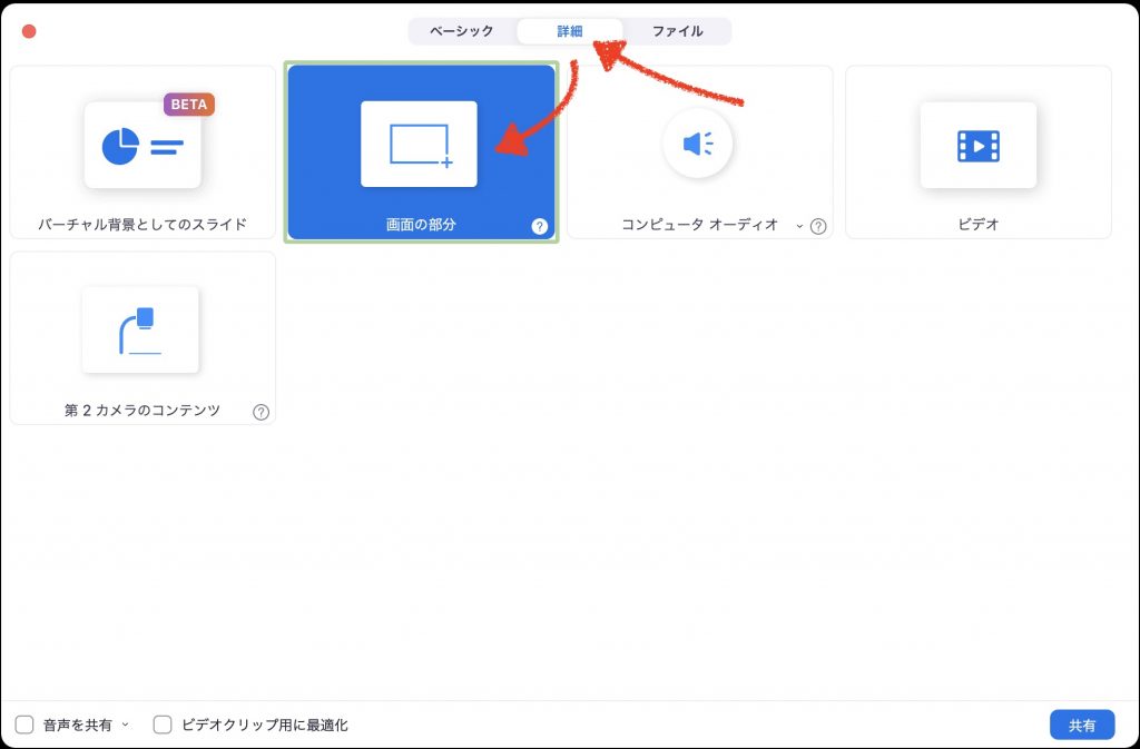 Zoomの画面共有をすると文字が小さくなってしまうので、大きく見せる方法はないかな? ウィンドウシェアをシェアする場合でもタスクバーとかを隠して見せたいな。 ## Zoomでデスクトップを共有すると相手は小さくて見づらい ミーティング相手がスマートフォンだったり小さな画面で見ている場合、大きなデスクトップPCのスクリーンを共有してしまうと、相手にはとても細かい表示になっていまいます。 ## ウィンドウの共有でもサイズの問題、メニューバーなどの無駄がある ウィンドウ共有の場合は、**ウィンドウサイズを小さくすれば、相対的に相手の画面に表示されるサイズは大きくなります** が、ブックマークバーやメニューバーなどが表示されてしまいます。 共有相手がパソコンであれば、ウィンドウサイズの調整で十分でしょうか、スマートフォンからの参加者がいる場合は少しでも大きく見せてあげたいものです。自分のタスクバーやタブ、ブックマークバーを隠した方がスマートに見えます。 相手がスマホで見ている場合は、相手にピンチアウトしてもらうことで見たい場所だけ拡大することができます。 ## 画面の一部分のみを共有する方法(Zoomの標準機能) Zoomの標準機能で、画面の一部分のみを共有する機能があります。 横長でサイズも固定された枠が表示され、その中が画面共有の対象になります。共有したい部分をここに合わせて配置、サイズ変更するようにしましょう。 この共有範囲のサイズは、おそらくZoomの標準画面解像度に合わせたものだと思います。 操作方法は、Zoomの「**画面の共有** 」>「**詳細** 」タブ>「**画面の部分** 」>**緑枠を画面共有したい位置に合わせる** [![Zoom画面共有の開始方法](/assets/images/2022/02/zoom-screen-partshare01-e1644477981857-1024x742.jpg)](/assets/images/2022/02/zoom-screen-partshare01-e1644477981857.jpg) [![](/assets/images/2022/02/zoom-screen-partshare02-1024x673.jpg)](/assets/images/2022/02/zoom-screen-partshare02-e1644478128141.jpg) [![](/assets/images/2022/02/zoom-screen-partshare03-e1644478316331.jpg)](/assets/images/2022/02/zoom-screen-partshare03-e1644478104948.jpg) [![](/assets/images/2022/02/zoom-screen-partshare04-e1644478115539.jpg)](/assets/images/2022/02/zoom-screen-partshare04-e1644478115539.jpg) [affi id=5] [affi id=3]